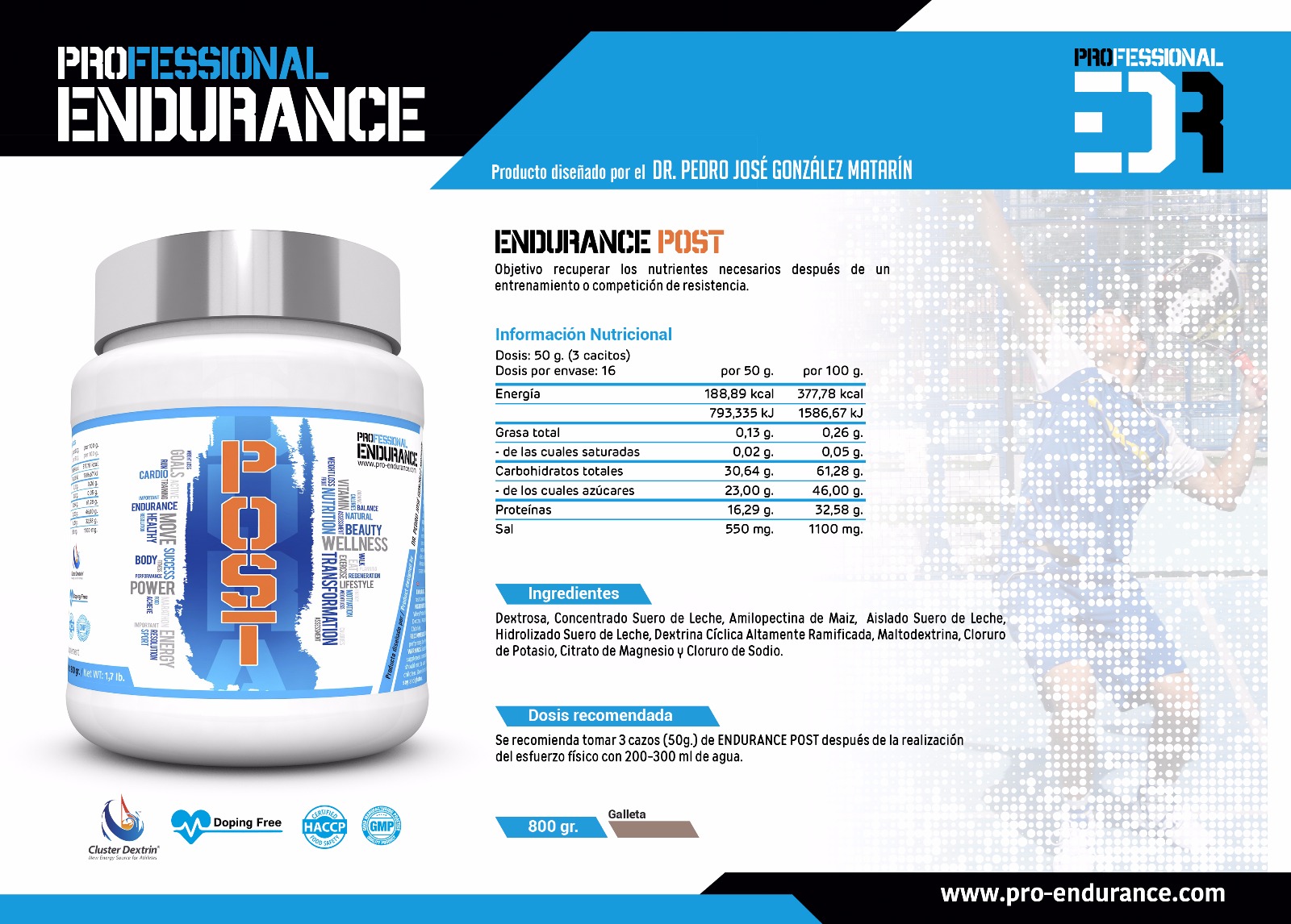 Producto diseñado para restablecer el organismo del desgaste sufrido tras la realización de un entrenamiento y/o de una competición de una forma rápida y eficaz. PROfessional ENDURANCE ha creado POST con una combinación óptima de nutrientes energéticos, recuperadores y equilibradores. Siendo un producto diseñado para reparar y recuperar al organismo para que la realización del próximo entrenamiento y/o competición sea más eficaz.
